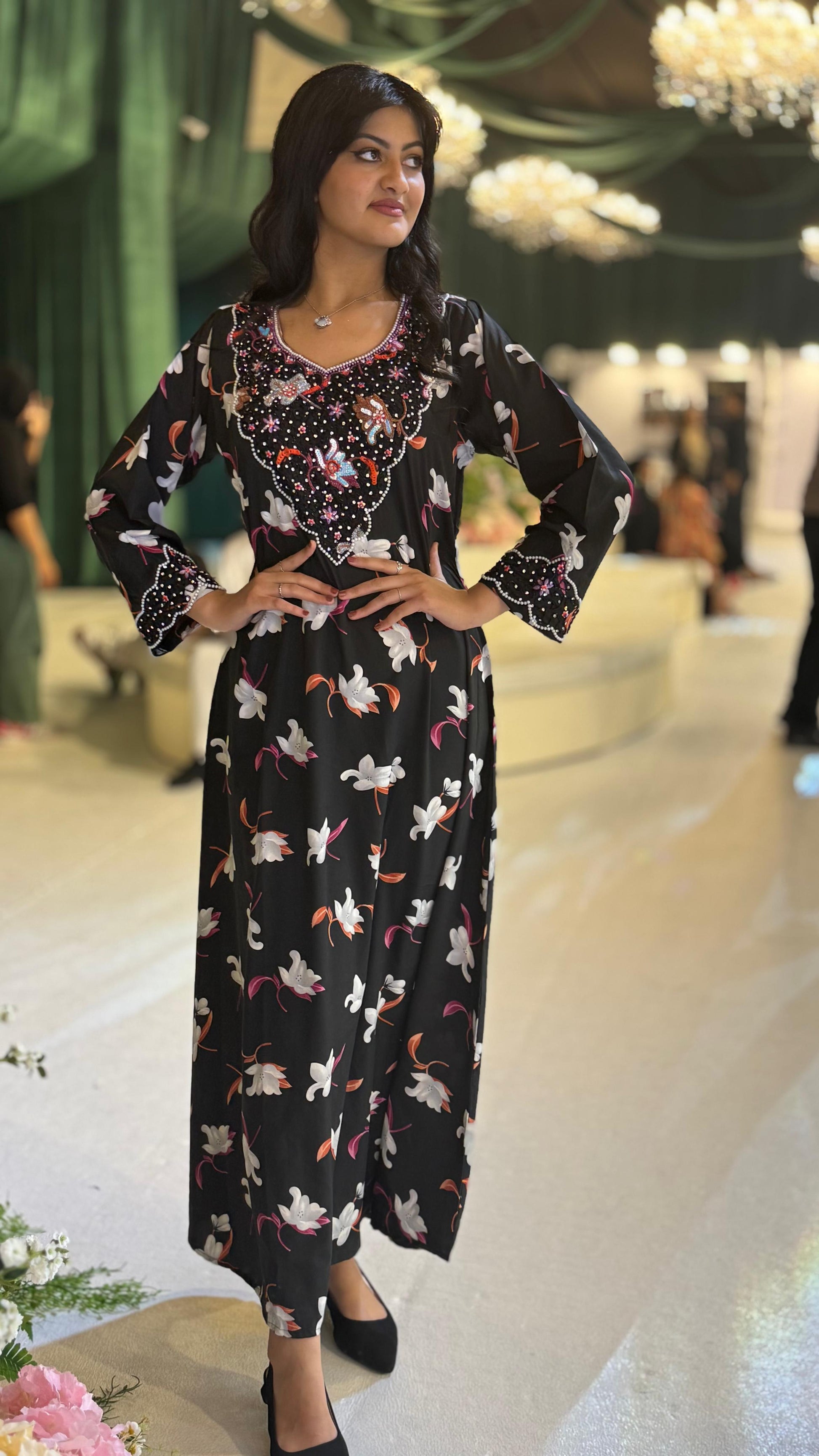 Designed on a deep jet-black base, the outfit features a soft floral print in white, pink, and peach tones — offering a graceful contrast that looks refined and modern.