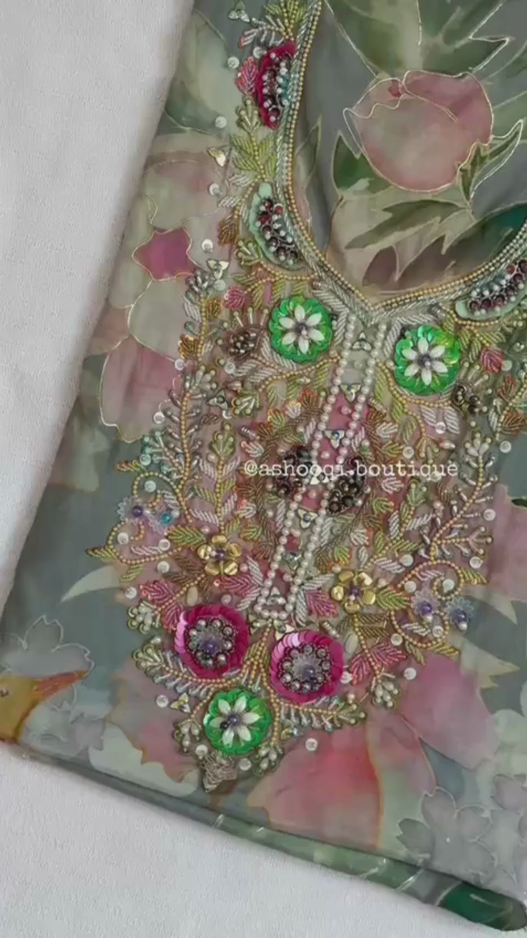 Step into subtle elegance with Pastel Garden, a serene creation from ASHOOQI’s Cotton Hareer Mezarai collection. Crafted on a soft sage-green base with muted pink florals, this piece blooms with intricate 3D hand embroidery — featuring pastel-hued sequins, pearls, and beads that shimmer delicately in every light.